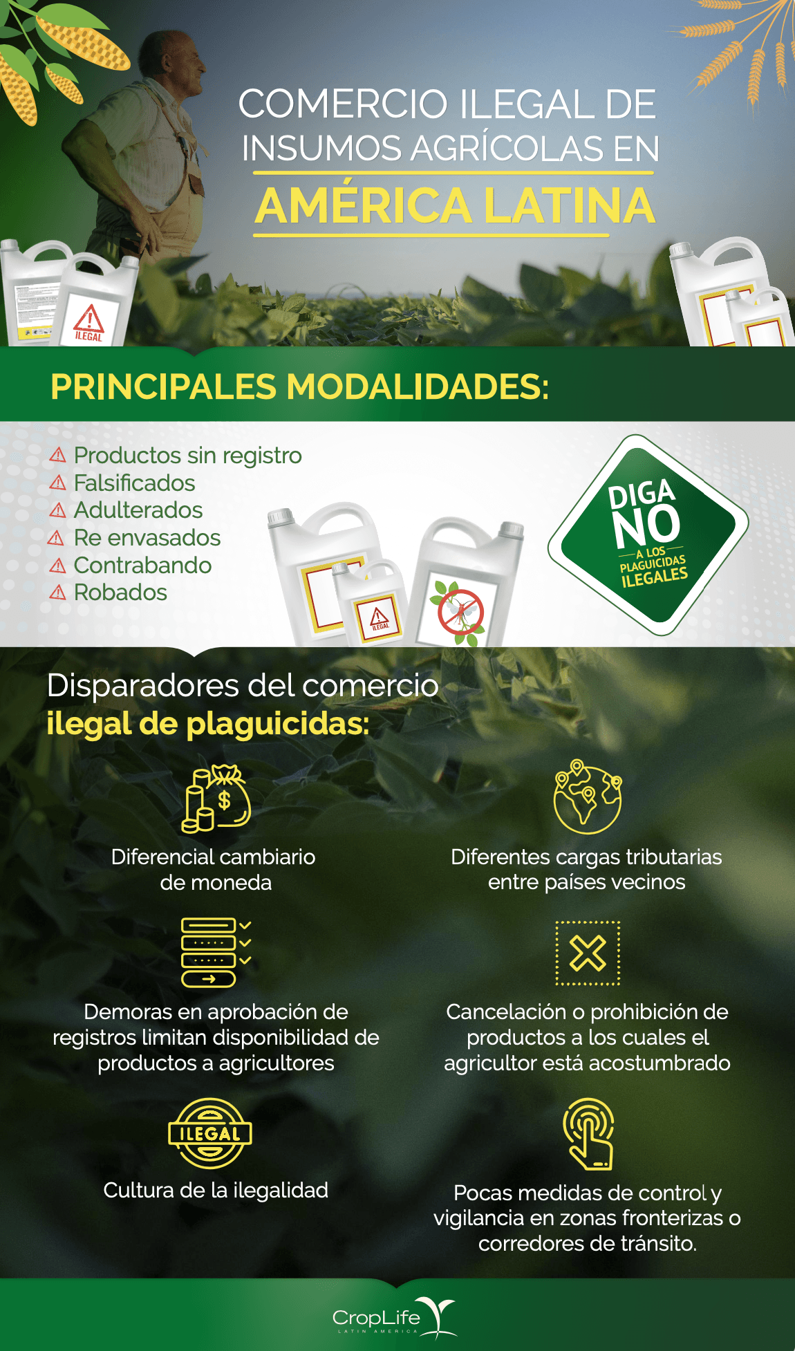 Infografía sobre las modalidades y disparadores del comercio ilegal de plaguicidas en Latinoamérica.