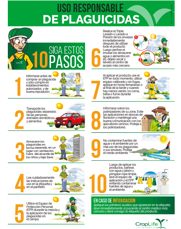 Para un uso correcto de plaguicidas o productos fitosanitarios, es necesario seguir 10 pasos, los cuales darán pautas para identificar cómo transportar los productos, cómo utilizarlos en los cultivo y cómo protegerte a ti mismo y al medio ambiente.