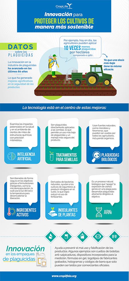 Infografía sobre la innovación y seguridad de los productos para la protección de cultivos y su rol en la sostenibilidad.